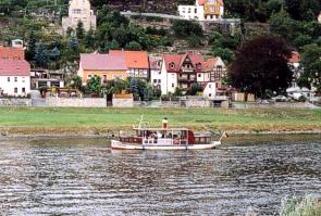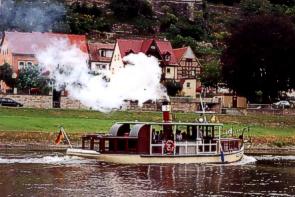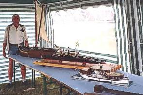 Schiffsmodellausstellung im Zelt präsen- tiert Fährmann Matthes (leider) nur drei Modelle, darunter auch das des letzten Fährdampfers "Wehlen - Bastei", jetzt "Technisches Denkmal". ![]() Bild rechts: am Nachmittag gab es als besondere Attraktion stündlich Fahrten von Wehlen bis Rathen |