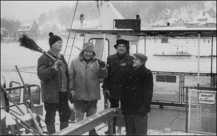 Fährmänner 1968 in Stadt Wehlen: v.l.n.r. Fährmeister W. John, H. Seedorf, H. Hesse aus Zeichen, H. Pönitz |