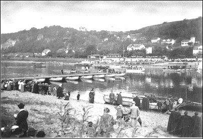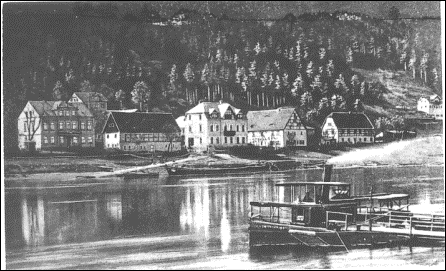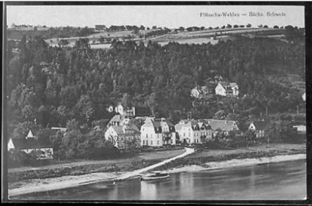 Das Kaisermanöver im Jahre1911. Bei diesem Manöver wurde auch die Wehlen-Pötzschaer Prahmfähre und wie hier im Bild, Schaluppen der Wehlen - Pötzschaer Fähre eingesetzt. Rechts vorn im Bild: Der mittlere der drei schwarz gekleideten Herren ist der Sachsen- König Friedrich August. Er besichtigte das für die damalige Zeit sehr fortschrittliche Manöver. Der Brückenschlag über die Elbe fand auf Pötzschaer Seite unterhalb des Bahnhofsparkplatzes und auf Wehlener Seite oberhalb der Dampfschiffanlegestelle statt. |