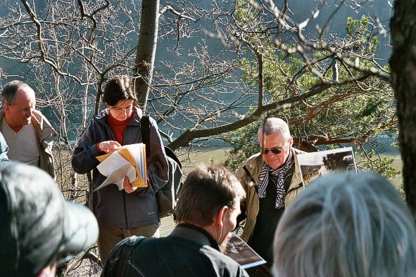 ![]() Station 5: An der Felskante zwischen Steinbruch und Sommersitz. Die Wanderung wurde von Constantin Cassel mit einer Fülle von Bildern, Geschichten und anderen Zeitdokumenten äußerst interessant gestaltet. Hier befinden wir uns an einem besonders markanten Punkt: Ein vorn an der Felskante liegender großer Felsbrocken diente als Aussichts- und Ruhepunkt für jeden einzelnen der Familie Cassel, ein Platz, zum "in-sich-hineingehen", wie ihn Con nannte. Sowohl bei Freude als auch bei Leid suchte ihn jedes Familienmitglied irgendwann einmal auf, völlig unabhängig voneinander, "wenn es einem eben danach war..." Leider hat sich im Laufe der Jahre - insbesondere durch den Straßenbau für den Steinbruch - vieles verändert: ein Ferienhaus wurde abgerissen und vieles ist zugewachsen, sodass man die einstige Idylle nur noch erahnen kann. Von diesem Platz aus hatte man elbabwärts in Richtung Westen einen wunderschönen Blick auf das Atelierhaus, der von Pol Cassel im Jahre 1925 in mehreren Bildern festgehalten wurde. Die Bilder, die Con hier zeigt, sind auch in der Ausstellung zu sehen. |
