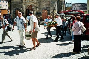 ![]() Endlich eingetroffen - mit einer Stunde Verspätung. Die Gastgeschenke werden in das Rathaus getragen. |