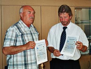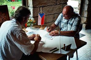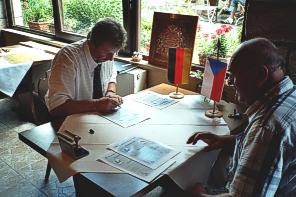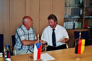 ![]() Es sind jeweils zwei Urkunden zu unterzeichnen (eine in Tschechisch und eine in Deutsch), hier agiert Milos Repa, Bürgermeister von Travcice. |