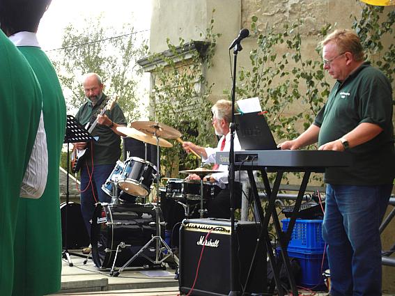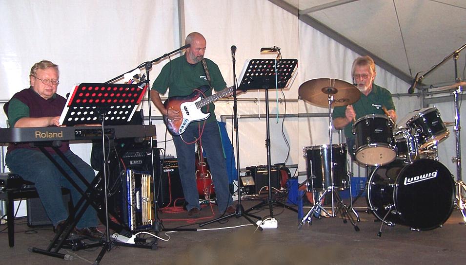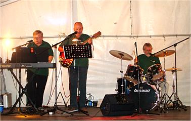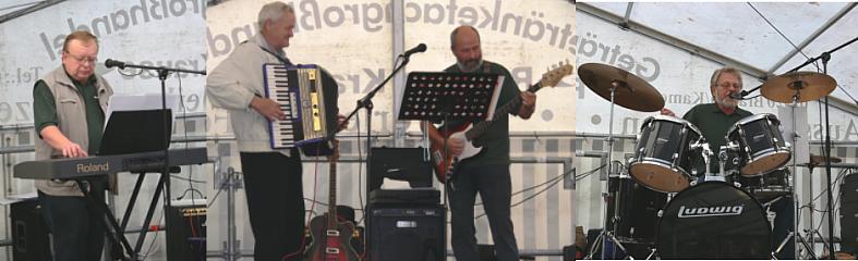 | [Bild links]: Auftritt des Struppener Chors, Dirigent: Gernot Jerxsen [rechts] Die ELECTRONICS als Begleitband - für einige Titel | ||