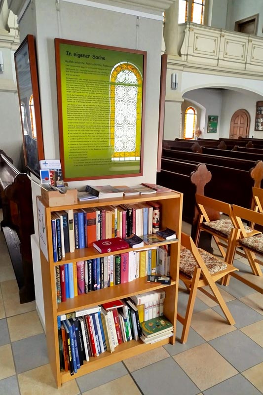 Die Radfahrerkirche Stadt Wehlen bietet einen kleinen Bücherschrank im Hauptschiff. In der Ruhe der Kirche oder auch im Pfarrgarten zur Elbe findet sich immer auch ein Plätzchen zum Schmökern.