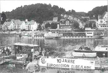 Mlyn an die Bürgermeister der Elb- städte übergeben. In Wehlen begrüßen Bürger, Schiffervereine, unser Bürgermeister und der Präsident der Euroregion Ebe/Labe, Herr Evers, die Flößer und nahmen einen kräftigen Schluck "Elbwasser" von der Quelle. Abends wurde auf dem Dampfer Sachsenwald mit Lagerfeuer noch lange gefeiert. Vielen Dank an alle, die mitgeholfen haben. Vielleicht in vier Jahren wieder... ![]() Karlheinz Petersen I. Vorsitzender Schifferverein zu Stadt Wehlen |