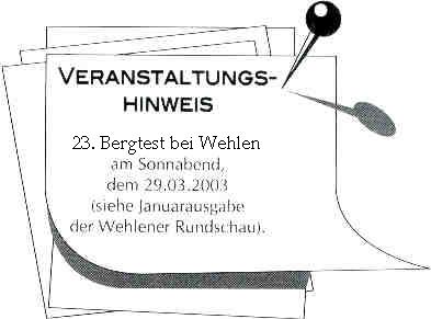 Thema: - Öffentliche Bekanntmachung des Entwurfes der Haushaltssatzung und des Haushaltplanes für das Jahr 2003: Auslegung von Donnerstag, den 06.03. bis Freitag, den 14.03.2003 - Mitteilung der Gemeindekasse: Einzugsermächtigung für Steuern und Abgaben >>> Formular zum Ausdrucken <<< - Besuch unserer Partnerstadt Wehlen / Mosel geplant: vom 29. Mai bis 1. Juni 2003 zu den "Tagen der offenen Weinkeller", Interessenten bitte im Rathaus melden. . |