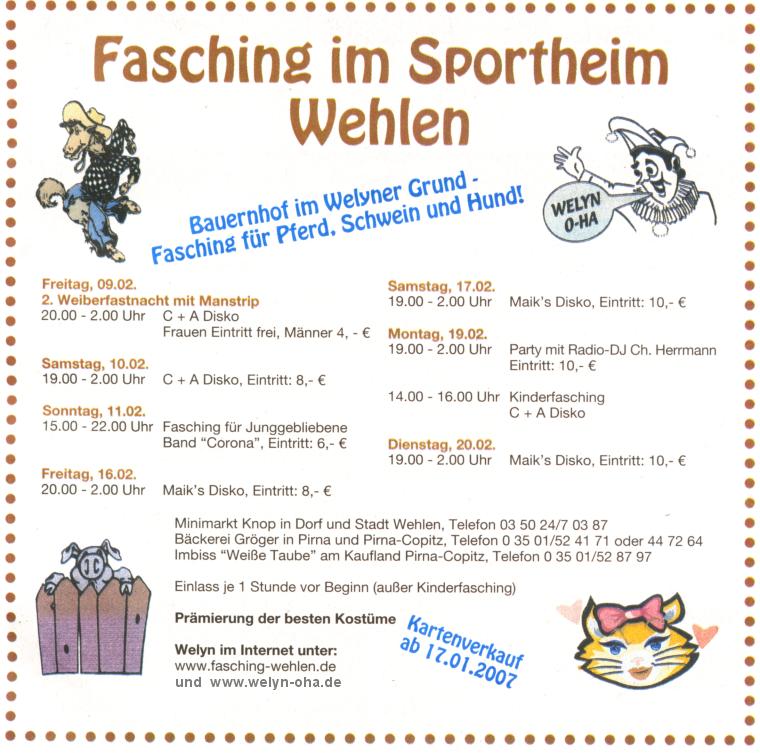 Thema: - Bekanntmachung des Beteiligungsberichts zum 31.12.2006 des Zweckverbandes Gewerbepark "Sächsische Schweiz" - Altersstruktur der Stadt Wehlen per 31.12.2006 - Gewerbeflächen in Stadt Wehlen im teilsanierten historischen Objekt, jetzt "Touristenhaus" Stadt Wehlen >>> lesen... - Veranstaltungen für unsere Einwohner und Gäste im Februar 2007 - Das "Fichtenhausen der Neuzeit": Eine Zeitreise nach Fichtenhausen 2006 - "In 60 Minuten um die Welt" - TUS Einheit Wehlen - Kurzbericht aus der Winterpause - mit Ergebnissen der Kreisliga in der 1. Halbserie 2006/2007 - Jahreskalender 2007 Stadt Wehlen - zum Selbstausdrucken und Basteln >>> zum Download aus vorigen Ausgaben: - aktuell: Wohnungen und Gewerbeflächen zu vermieten >>> siehe auch unter "Mitteilungen aus dem Rathaus" - Öffentliche Grundstücksausschreibung "Schützenhaus" am Hausberg in Stadt Wehlen >>> den ganzen Artikel lesen . |