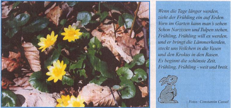Thema: - Niederschrift der 27. öffentlichen Sitzung des Stadtrates der Stadt Wehlen am Dienstag, dem 13. März 2007, 19:00 Uhr in der Grundschule, Lohmener Straße 3 - Öffentliche Bekanntmachung der Haushaltssatzung des Zweckverbandes Gewerbepark "Sächsische Schweiz" für das Haushaltsjahr 2007 - Gewerbeflächen in Stadt Wehlen im teilsanierten historischen Objekt, jetzt "Touristenhaus" Stadt Wehlen >>> lesen... - Einladung zur Verbandsversammlung des Abwasserzweckverbandes Wehlen-Naundorf am Mittwoch, dem 11. April 2007 19 Uhr in der Grundschule Stadt Wehlen - Veranstaltungen für unsere Einwohner und Gäste im März 2007 - TUS Einheit Wehlen e.V. Fußball: Zwei Wehlener Mannschaften im Pokalfinale - Etwas zur Kirchengeschichte in Stadt Wehlen und wie die Wehlener Kirche zur ersten Orgel kam aus vorigen Ausgaben: - aktuell: Wohnungen und Gewerbeflächen zu vermieten >>> siehe auch unter "Mitteilungen aus dem Rathaus" |