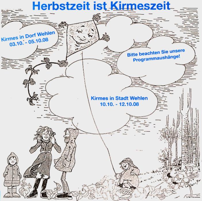 - Niederschrift der 43. öffentlichen Sitzung des Stadtrates der Stadt Wehlen am Dienstag, 09.09. 2008, 19:00 Uhr im Gemeindezentrum Dorf Wehlen, Schulstraße 6 - Öffentliche Bekanntmachung Haushalktssatzung und Haushaltsplan der Stadt Wehlen für das Haushaltsjahr 2008 - Öffentliche Bekanntmachung des Entwurfs der Haushaltssatzungen 2009 und 2010 sowie des Doppelhaushaltsplanes der Stadt Wehlen für die Haushaltsjahre 2009 und 2010 Einladung zur 27. öffentlichen Sitzung des Gemeinschaftsausschusses der Verwaltungsgemeinschaft zwischen der Gemeinde Lohmen und der Stadt Wehlen am 13. Oktober 2008 8:00 Uhr im Gemeindeamt Lohmen, 01847 Lohmen, Schloß 1 - Die Stadtverwaltung informiert: Anmeldung der Schulanfänger 2009 erfolgt im Sekretariat der Stadtverwaltung, Markt 5 am Dienstag, 7. Oktober und am Donnerstag, 9. Oktober 2008 jeweils in der Zeit von 8:00 - 12:00 Uhr und 13:00 - 15:00 Uhr - Touristinformation Lohmen und Wehlen informieren über Veranstaltungen im Oktober, siehe auch Veranstaltungskalender - Dorf Wehlener Kirmesprogramm vom 03.10. bis 05.10 2008 - Historisches: Das 125-jährige Kirchweihfest in Stadt Wehlen, ein Beitrag von W. Thomas . |